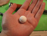乾いてから外すと"半分のライン"がついた半球ができるはずです。 そのラインまで削って、二つ合わせれば綺麗な球の出来上がり! 球は外れやすいので、合わせ目は瞬間接着剤でつけてください。(外にはみ出ないように) 合わせ目を角刀で掘った上で粘土多めに埋めて、磨けば完成です。 しかしスチロールはサイズがあまり豊富でないので、丁度いいサイズがあったらラッキー程度で 使うと良いと思います。粘土の縮みも考慮して型を利用すると良いかと。 型取りを知っている方なら「なぜ上下で取らないのだ!」となると思います。 最初から合わせて作ると球としてポンと出来るのは良いのですが、 合わせ目に接着剤を流せなかったりで強度が不安なのです。 粘土だけでくっつけてると作業中にパッカリ割れたりします(汗) |